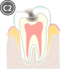C1 と同様に合成樹脂(レジン)を充填するか、範囲が大きい場合は削ったあとに歯型を取り、金属やセラミックの詰め物(インレー)を作り、欠損部を修復します。